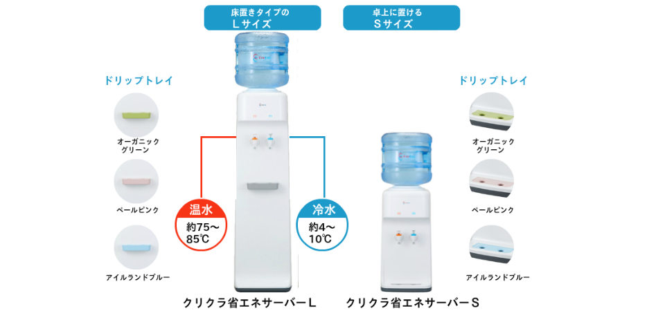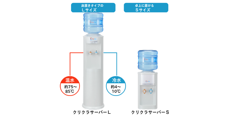 クリクラのサーバーは、L型とS型の2種類をご用意。設置場所や、お使いいただくシーンに合わせてお選びいただけます。もちろん、ご家庭のリビングやキッチンにも設置できるサイズですので、お子さまのいるご家庭や、毎日の水分補給を手軽に求められる皆さまにも、気軽に利用していただけます。